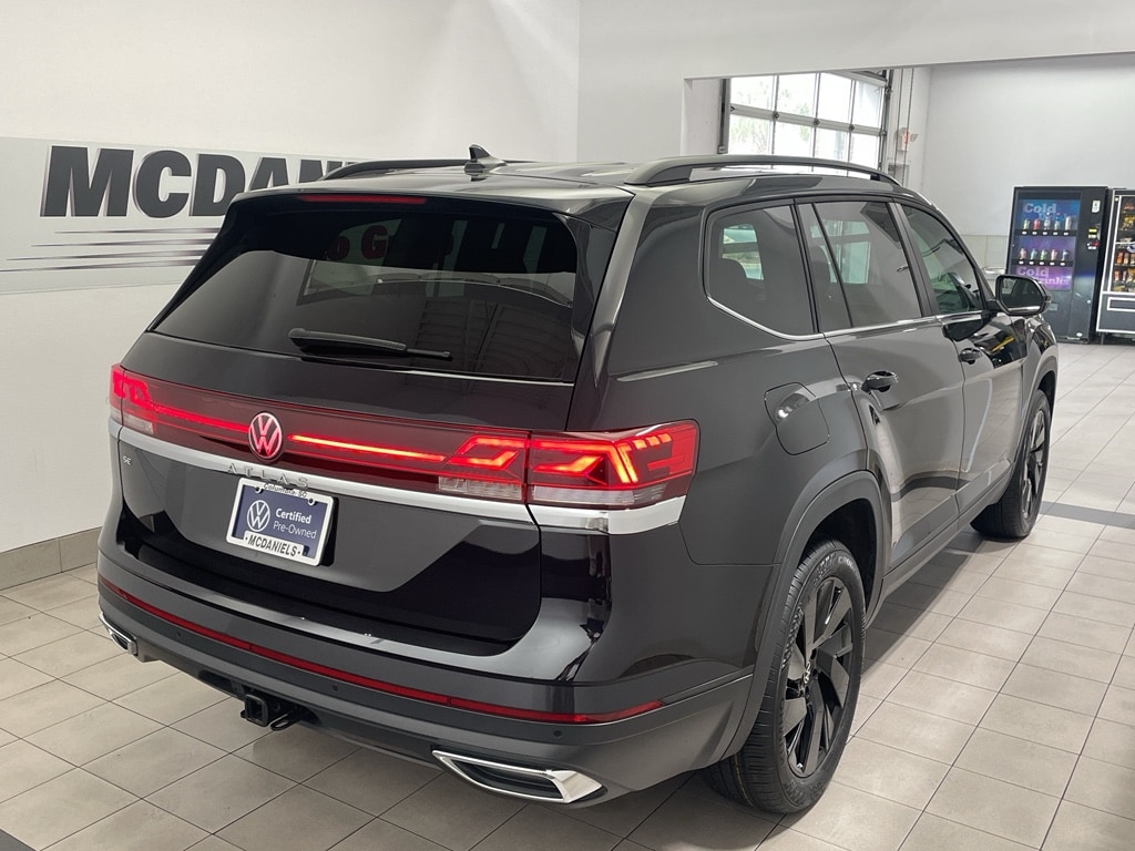Carry lots of cargo while your passengers are comfortable. The vehicle has auto-adjust speed for safe following. Light weight alloy wheels on this 2025 Volkswagen Atlas are the perfect compliment to a stylish body. It comes equipped with Android Auto for seamless smartphone integration on the road. Apple CarPlay: Seamless smartphone integration for it - stay connected and entertained on the go! This 1/2 ton suv has an automatic transmission. Protect this vehicle from unwanted accidents with a cutting edge backup camera system. This 1/2 ton suv has an elegant black exterior finish. This vehicle is a certified CARFAX 1-owner. The Volkswagen Atlas has a clean CARFAX vehicle history report. This 1/2 ton suv has gone through a stringent manufacturer pre-owned certification process, including a meticulous mechanical and reconditioning processes. Take the stress out of car buying with this certified pre-owned. Set the temperature exactly where you are most comfortable in this model. The fan speed and temperature will automatically adjust to maintain your preferred zone climate. Easily set your speed in this Volkswagen Atlas with a state of the art cruise control system. Increase or decrease velocity with the touch of a button. Electronic Stability Control is one of many advanced safety features on this model. This Volkswagen Atlas has a 4 Cyl, 2.0L high output engine. This Volkswagen Atlas's Forward Collision Warning system alerts the driver to potential front-end collisions, enhancing safety. The Volkswagen Atlas is front wheel drive. This Volkswagen Atlas is equipped with a gasoline engine. Bluetooth technology is built into this Volkswagen Atlas, keeping your hands on the steering wheel and your focus on the road. Keep your hands warm all winter with a heated steering wheel in this unit . The leather seats in this vehicle are a must for buyers looking for comfort, durability, and style. With the adjustable lumbar support in this 2025 Volkswagen Atlas your back will love you. Load groceries and much more with ease into this model thanks to the power liftgate. Never get into a cold vehicle again with the remote start feature on this 1/2 ton suv.